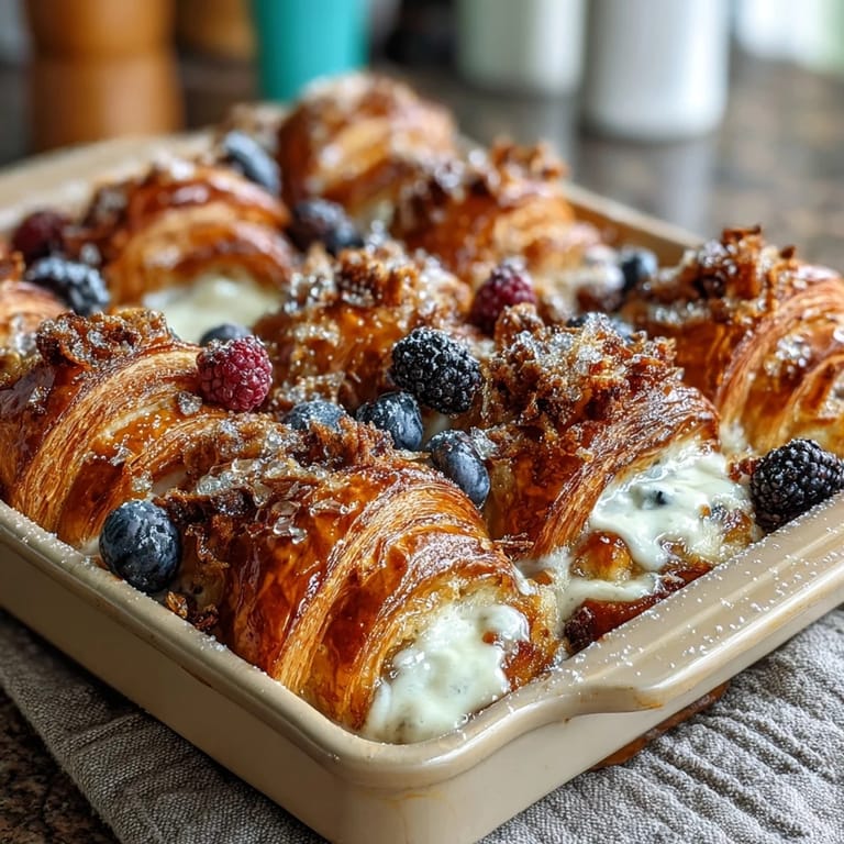 Pin it The beauty of this casserole lies in its simplicity and versatility. Buttery croissants soak up a rich custard made with eggs, whole milk, heavy cream, and warm spices, creating layers of texture that range from crispy edges to soft, custardy centers. The mixed berries—blueberries, raspberries, strawberries, and blackberries—burst with juicy brightness in every bite, balancing the richness beautifully. A sprinkle of turbinado sugar on top caramelizes as it bakes, giving you that irresistible golden finish.