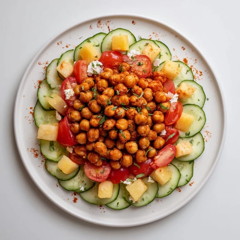 - Place your large round platter on a clean, well-lit surface—good lighting matters for this moment. Starting from the outer edge, arrange the spicy chickpeas in a thick, even circle, leaving room for the next ring. Work slowly and intentionally, almost like you're creating a mandala. Next, moving inward, arrange the savory cucumber mixture in its own distinct ring, keeping clear space between them. Finally, fill the innermost circle with your sweet fruit mixture. Step back and admire your work. This is the moment you realize that cooking is indeed an art