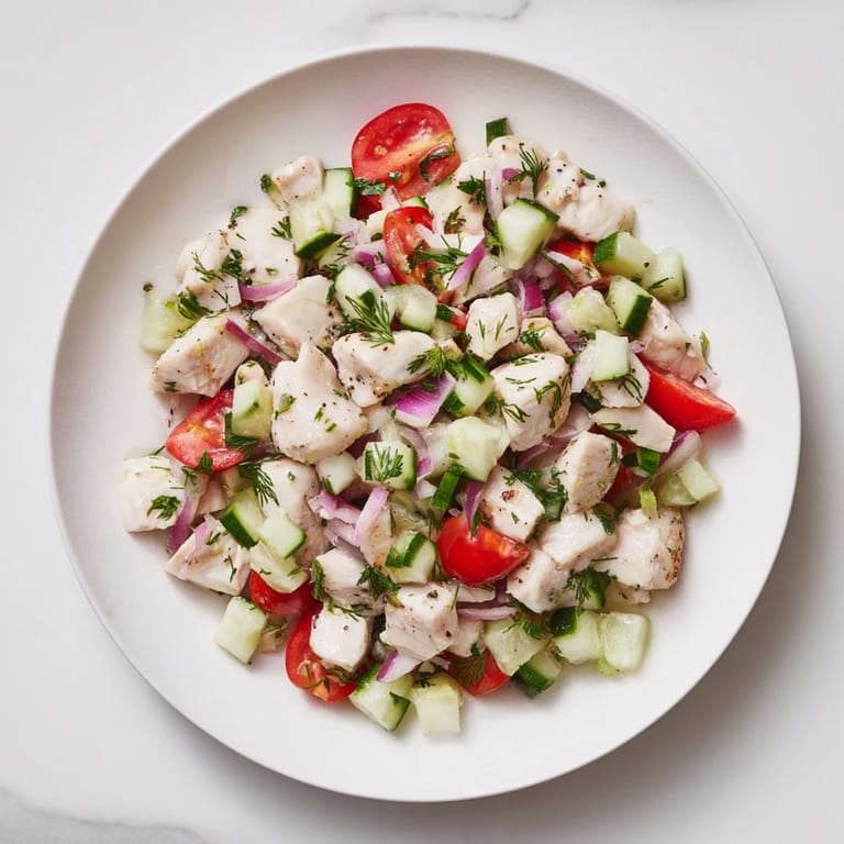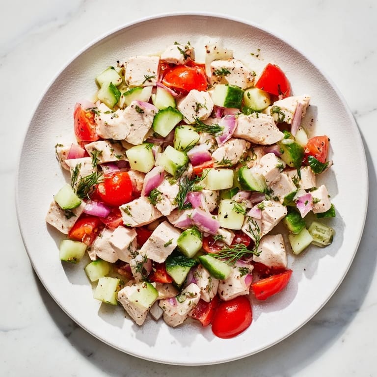 Pin it There's something about the smell of poaching chicken that fills a kitchen with such quiet promise. I discovered this salad on a warm afternoon when I had leftover herbs wilting in the crisper and suddenly wanted something light but filling, something that didn't need oil to taste alive. The first time I made it, I was surprised by how the vinegar and lemon could do all the heavy lifting, making every vegetable taste brighter than it had any right to be.