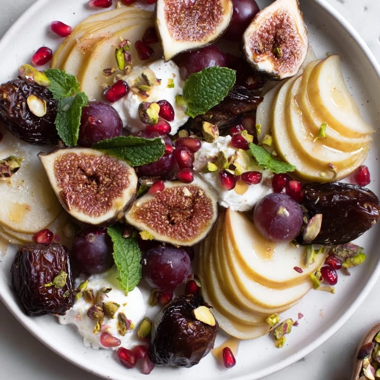 - Fresh Fruits: 8 fresh figs halved, 12 Medjool dates pitted and halved, 1 ripe pear thinly sliced, 1 small bunch red grapes halved