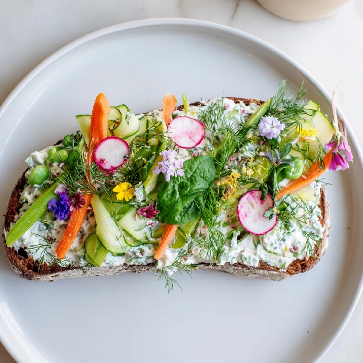 Pin it A vibrant, open-faced sandwich featuring crisp garden vegetables, creamy herbed cheese, and rustic bread, evoking the freshness of a spring meadow Perfect for light dinners or garden lunches