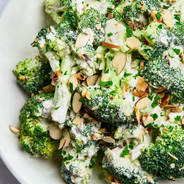 Pin it I used to think broccoli salad was just a potluck filler until a neighbor showed up with hers at a summer barbecue. It disappeared before the burgers were ready. The creamy garlic-Parmesan dressing clung to every floret, and the crunch from toasted almonds made it impossible to stop at one bite. I asked for the recipe immediately.