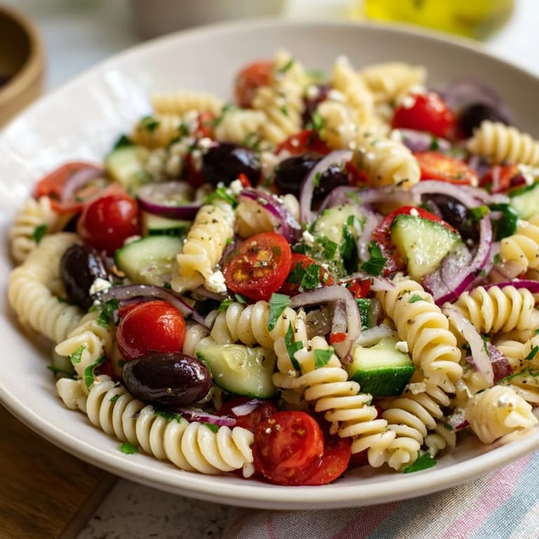 Pin it A vibrant, refreshing pasta salad featuring tangy feta, briny olives, ripe tomatoes, and crisp vegetables—all tossed in a zesty olive oil dressing. The perfect light Mediterranean-inspired plate for warm weeknight dinners.