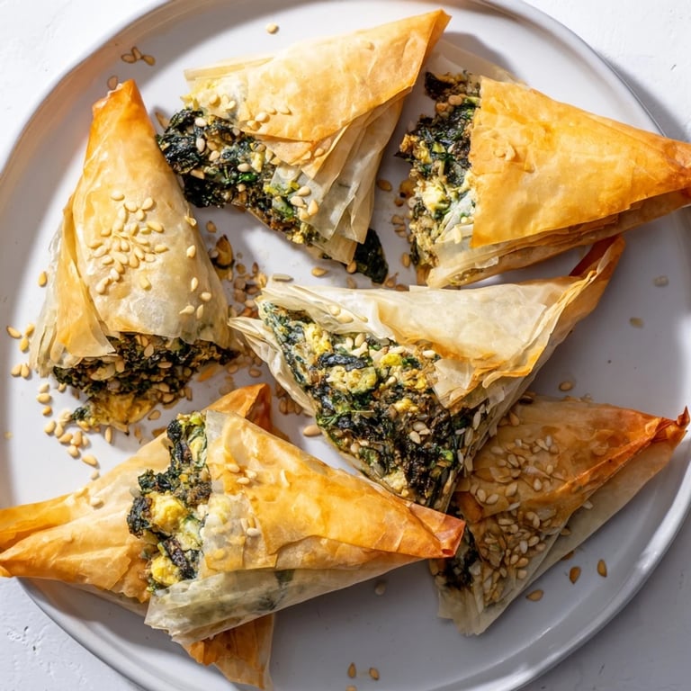 Pin it This recipe balances a homemade filling that melds tender spinach and creamy cheeses with spices and fresh herbs, all encased in buttery, crispy phyllo. The technique of folding into triangles ensures consistent portions and a charming presentation. Baking the triangles together as a cluster not only saves oven space but creates an impressive dish that guests will love to pick at.