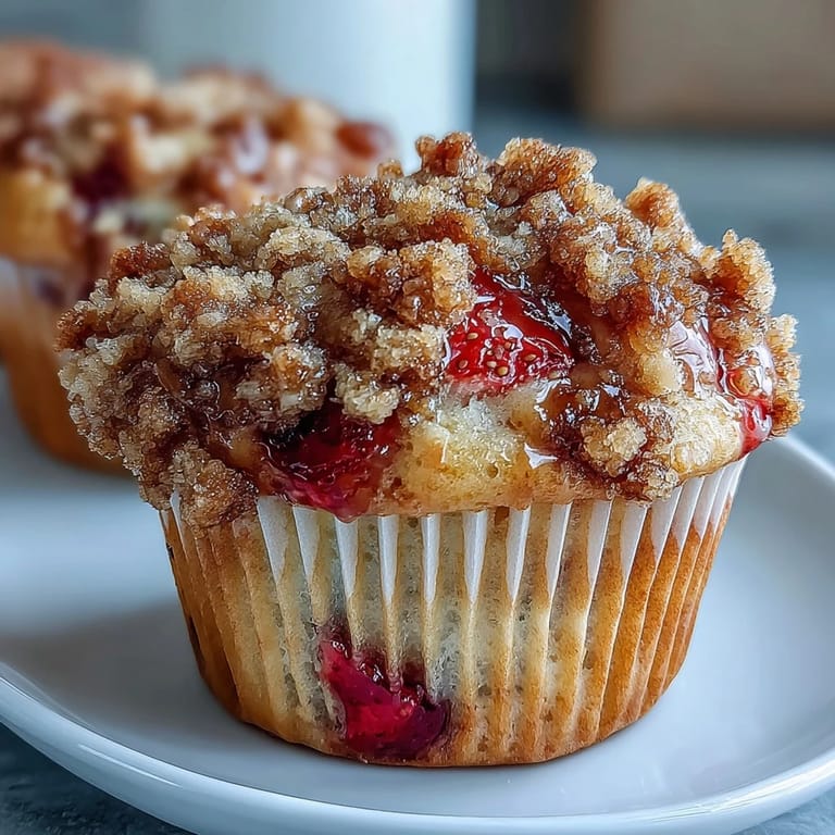 Pin it My neighbor stopped by one June morning with a basket of strawberries so perfectly ripe they practically glowed red on her kitchen counter. She mentioned offhand that she'd been making these muffins all week, and watching her pull a warm batch from the oven—steam rising, that buttery crumble catching the light—something just clicked. I had to learn her secret that afternoon, and now these are the muffins I reach for whenever I want something that feels both homey and special.